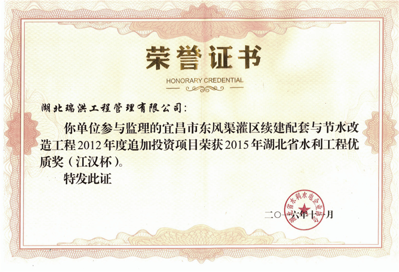 多年来,公司始终坚持以规范促监理,靠质量求生存,向市场要效益,创品牌谋发展,兢兢业业地投入监理实践,实现了工程建设质量和监理业务质量的“双丰收”,并获得多项殊荣,建立了良好的社会口碑和品牌效应。公司先后被评为水利部AAA级信用企业;湖北省高新技术企业、专精特新中小企业、“青年文明号”企业、先进基层党组织、“守合同 重信用”企业;荆门市服务业“五个十工程”重点企业、爱心企业等。